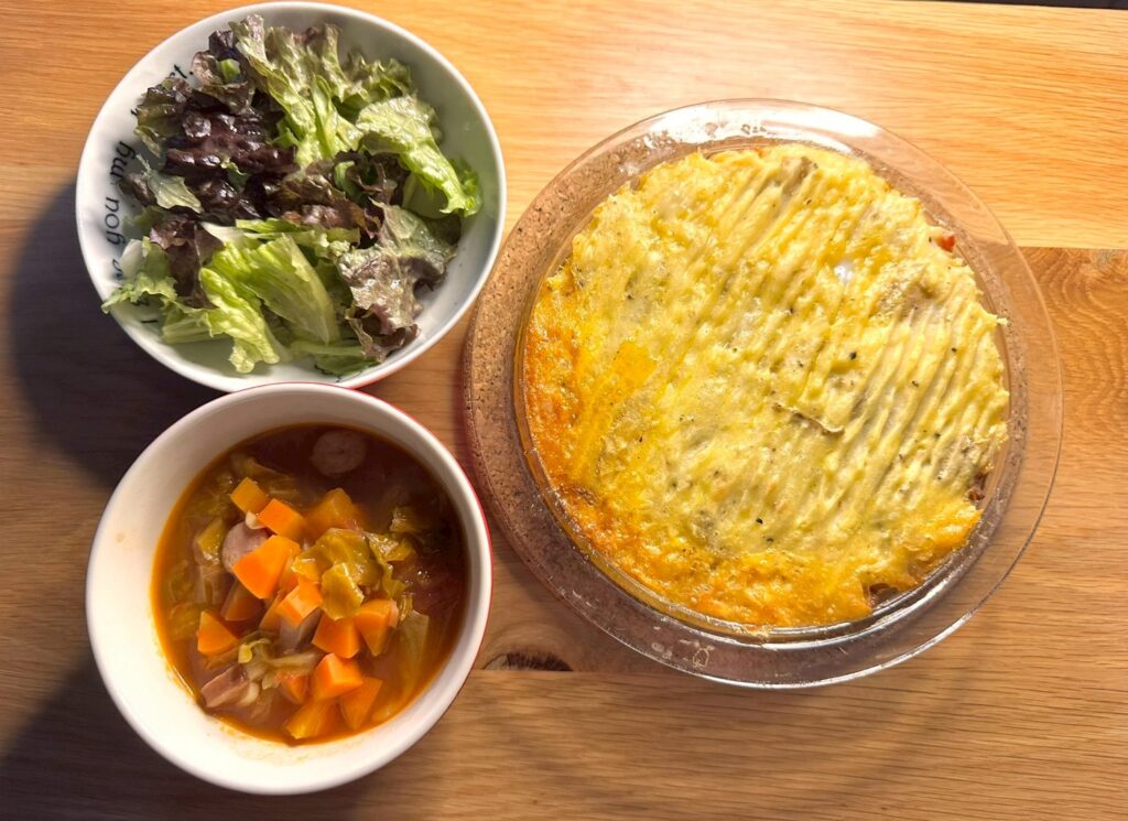 シェパーズパイをメインに、グリーンリーフのサラダと、スープにミネストローネを用意しました。