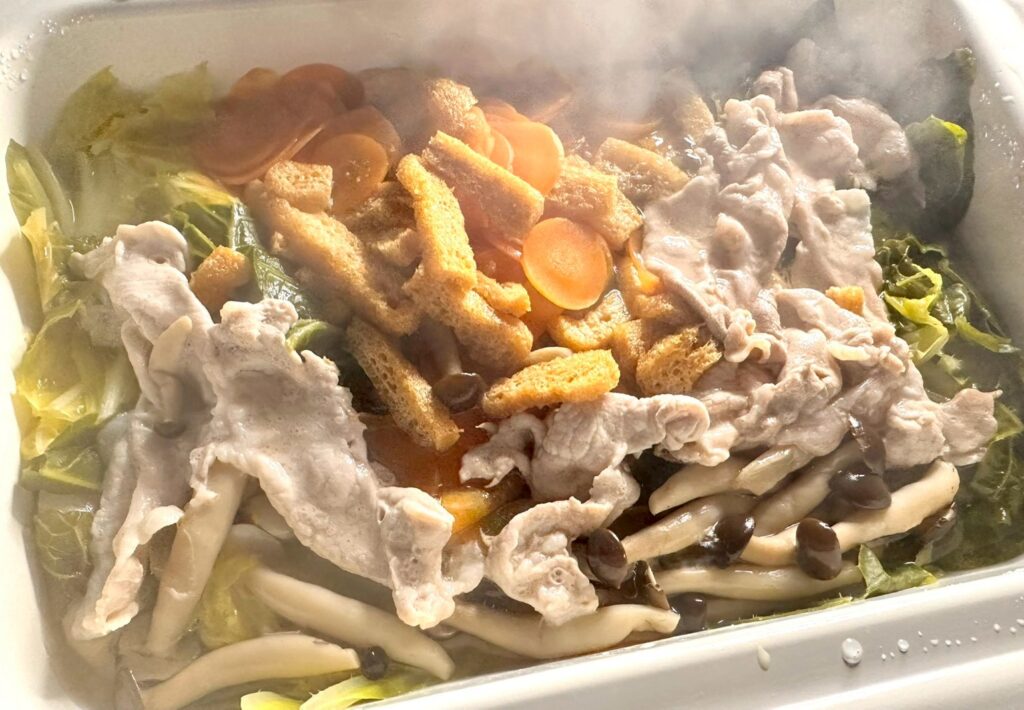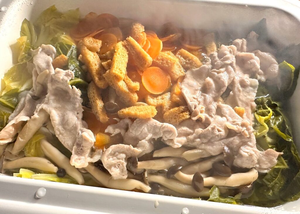 ▲野菜をじっくり煮たあとに、豚しゃぶ肉をいれてサッと火を通し、いざ実食!