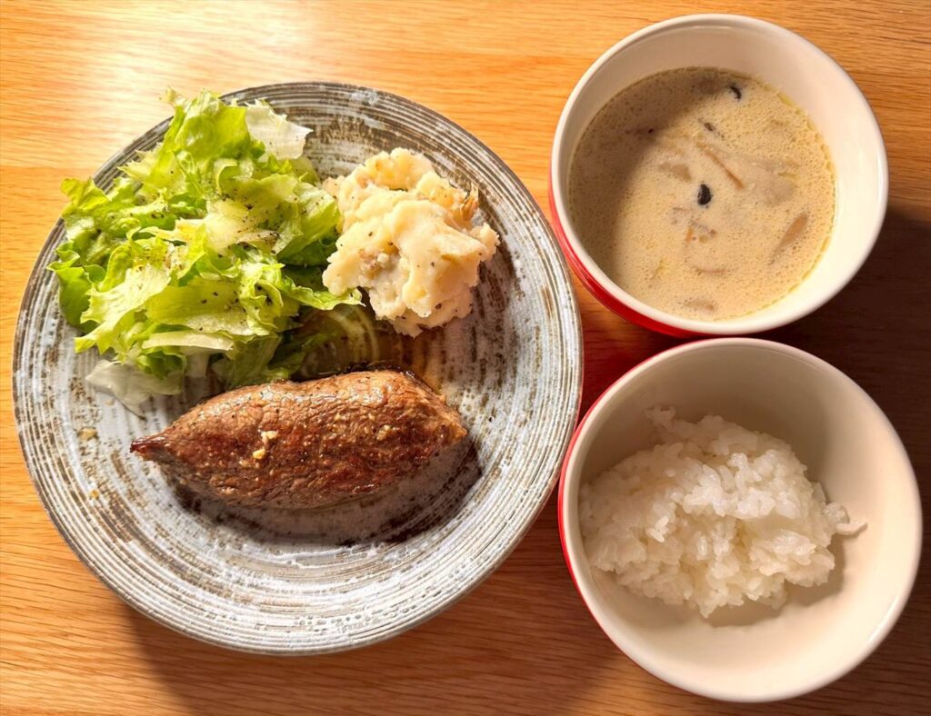 コストコのミスジステーキ肉、付け合せのレタス・マッシュポテト。ご飯にきのこのクリームスープです。