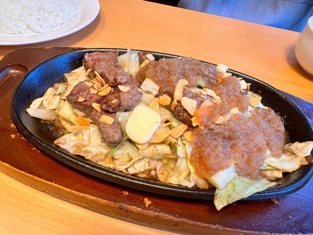 たっぷりのキャベツの上に、フライドガーリック、牛ハラミが乗り、そこにステーキ宮のタレがたっぷりとかかったスタミナあふれる鉄板料理。こちらも美味しそうだったな!