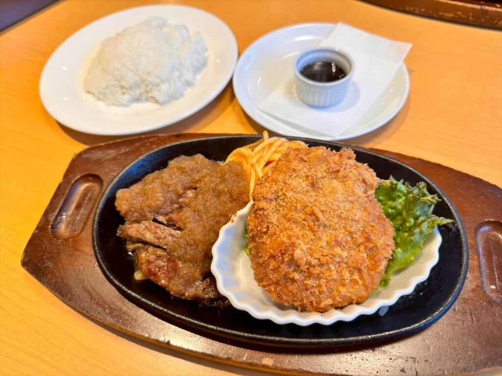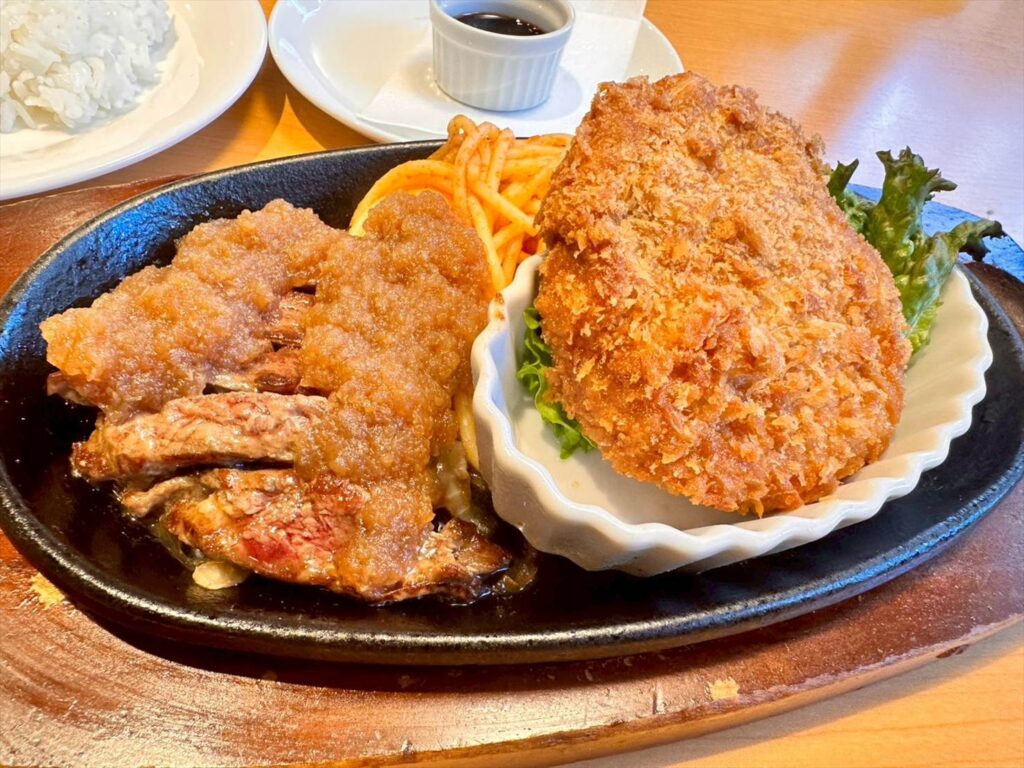 ジュージューと音を上げる熱々の鉄板で、オーダーしたランチ「牛メンチカツと牛ハラミ80g」が届きました!