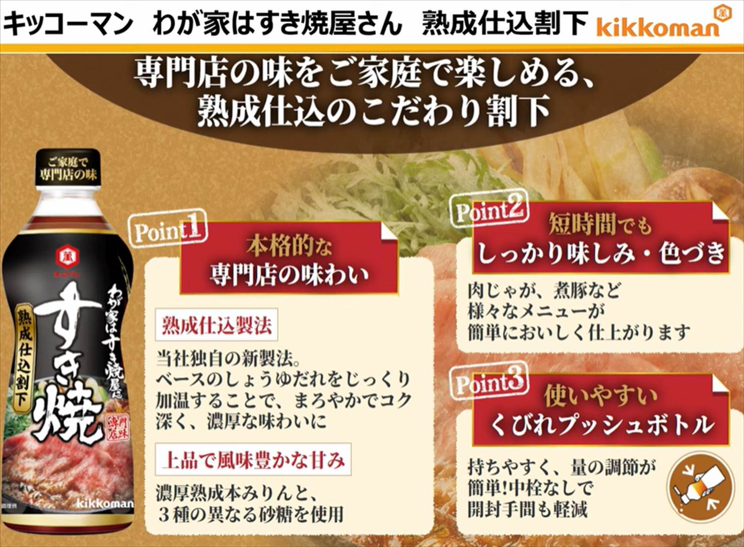 熟成仕込のコク深い割下が、家でも特別感のあるすき焼きを実現します。