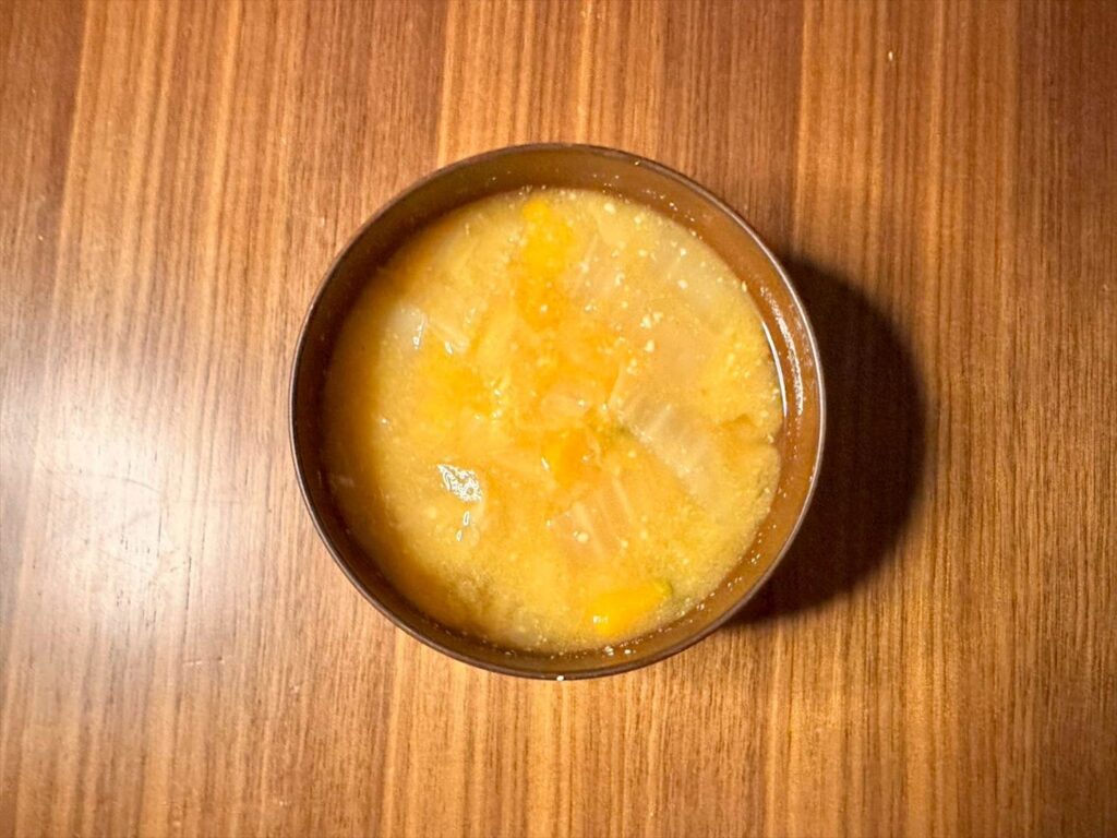▲味噌汁は冷蔵庫で余っていた白菜とかぼちゃを投入したもの。