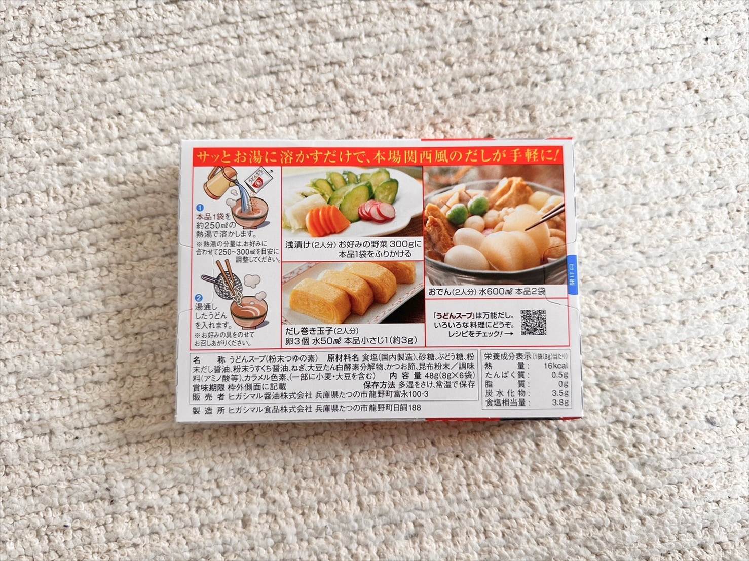 ▲パッケージの裏面にはうどんスープの使い方のほか、簡単なアレンジレシピまで載っていました!