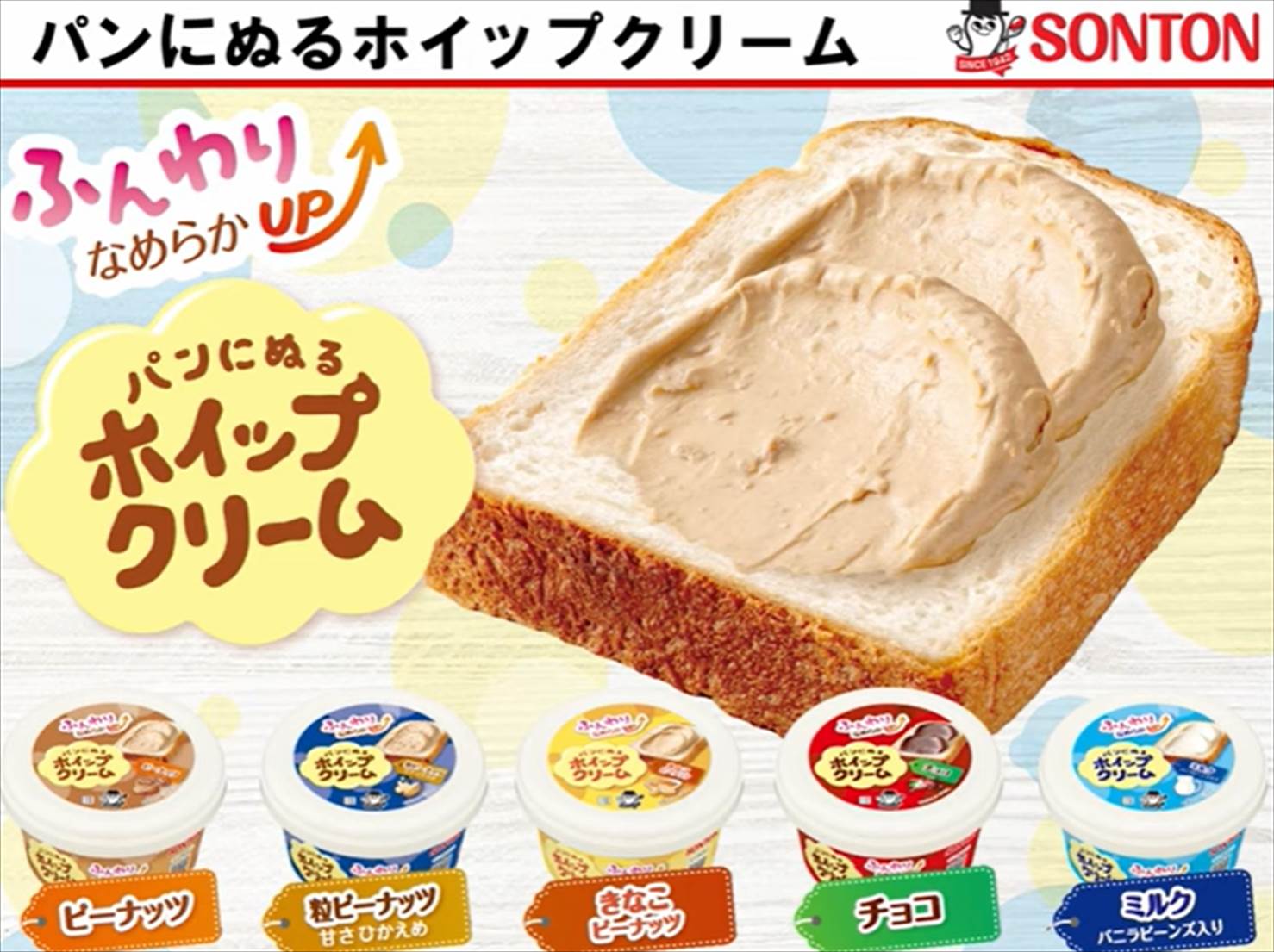 「ソントン パンにぬるホイップクリームシリーズ」は、ふんわりとした軽い食感とクリーミーな味わいが楽しめるスプレッドです。